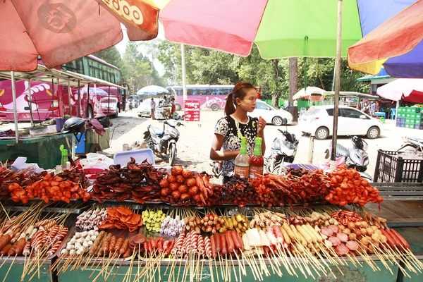 緬甸人習慣用火烤食物,烤熟后撒上鹽,用手撕著吃。植物園門口,賣燒烤的攤位上堆滿了烤串。