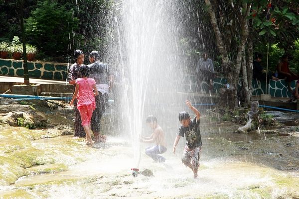 佛窟洞前的噴泉,小孩子在沐浴玩耍。