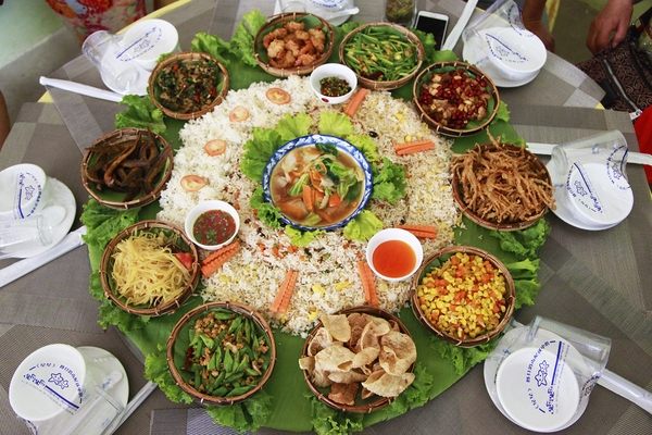 中午,特意為爸爸媽媽們準備了緬甸傳統美食——手抓飯。手抓飯首先要鋪好洗干凈的芭蕉葉,把松軟可口的米飯放中間,配以各種各樣的地道菜式,色彩斑斕,看起來就好好吃。