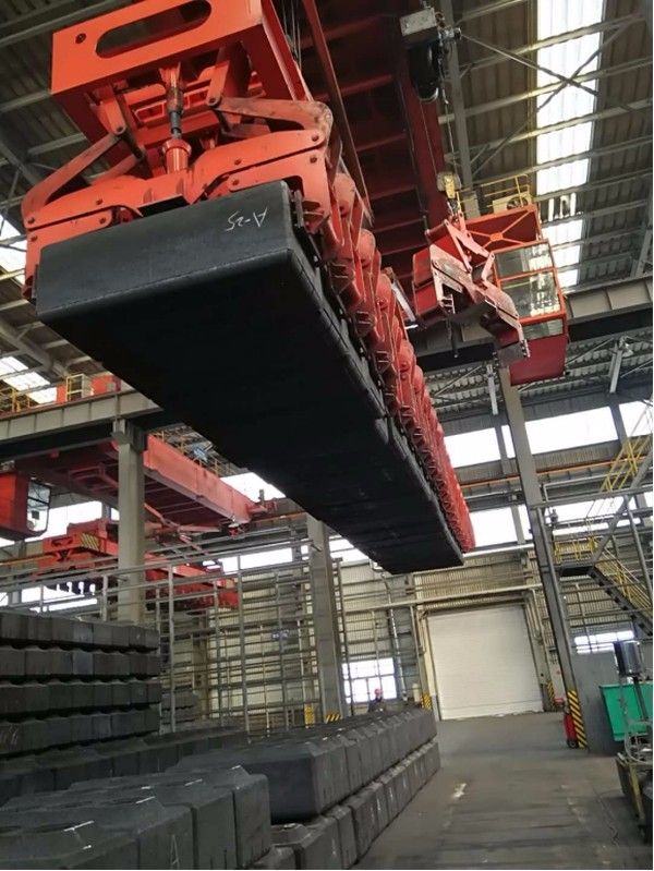 本產(chǎn)品通過(guò)自動(dòng)夾鉗,每次可夾取21塊陽(yáng)極碳?jí)K,***高可堆成8層。橋架下面裝有工字鋼,工字鋼上裝有5t電動(dòng)葫蘆,該葫蘆沿工字鋼運(yùn)行,可通過(guò)單塊自動(dòng)碳?jí)K夾鉗夾取碳?jí)K,還可在車(chē)間吊運(yùn)零星雜物。運(yùn)行和起升全部采用變頻調(diào)速,全部操作均可在操縱室內(nèi)完成。采用機(jī)械重力式自動(dòng)夾取代替氣動(dòng)方式夾取碳?jí)K,為制造廠和用戶(hù)大大節(jié)約了成本。